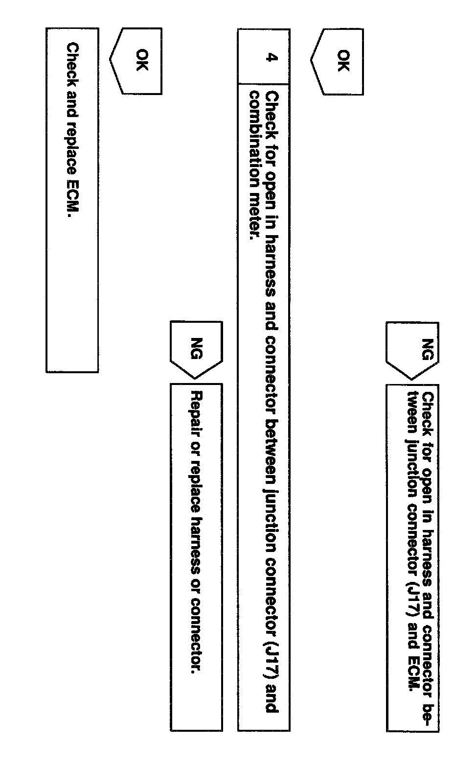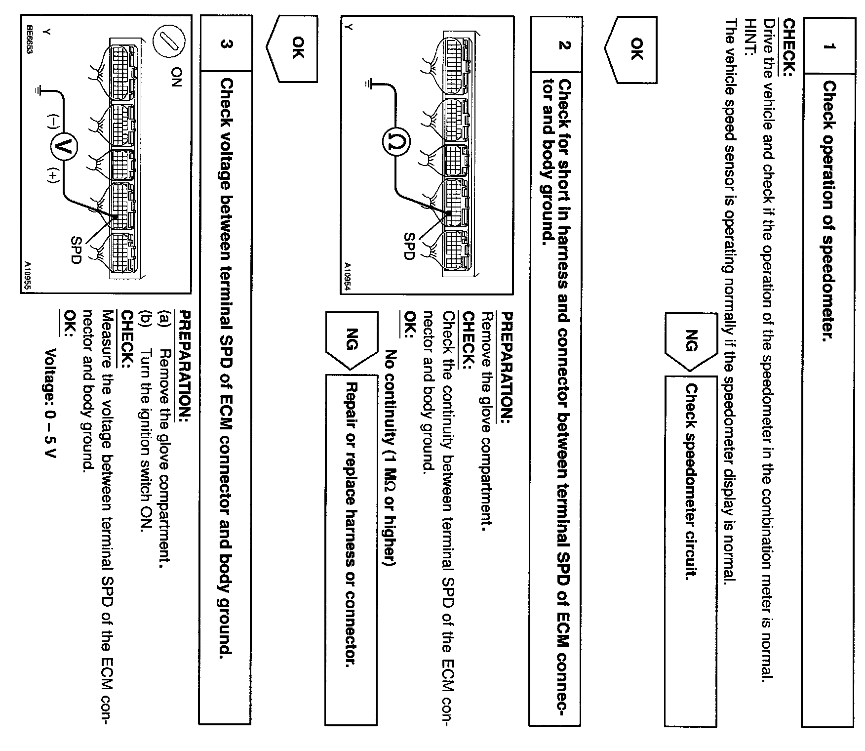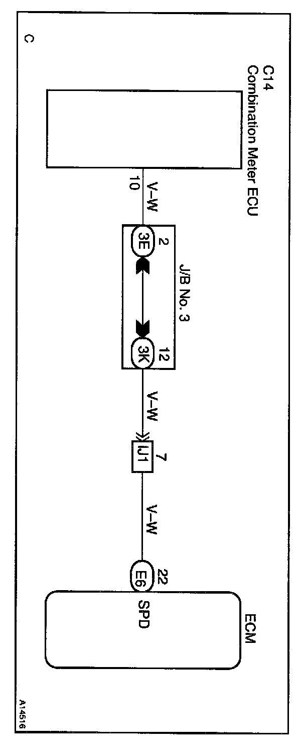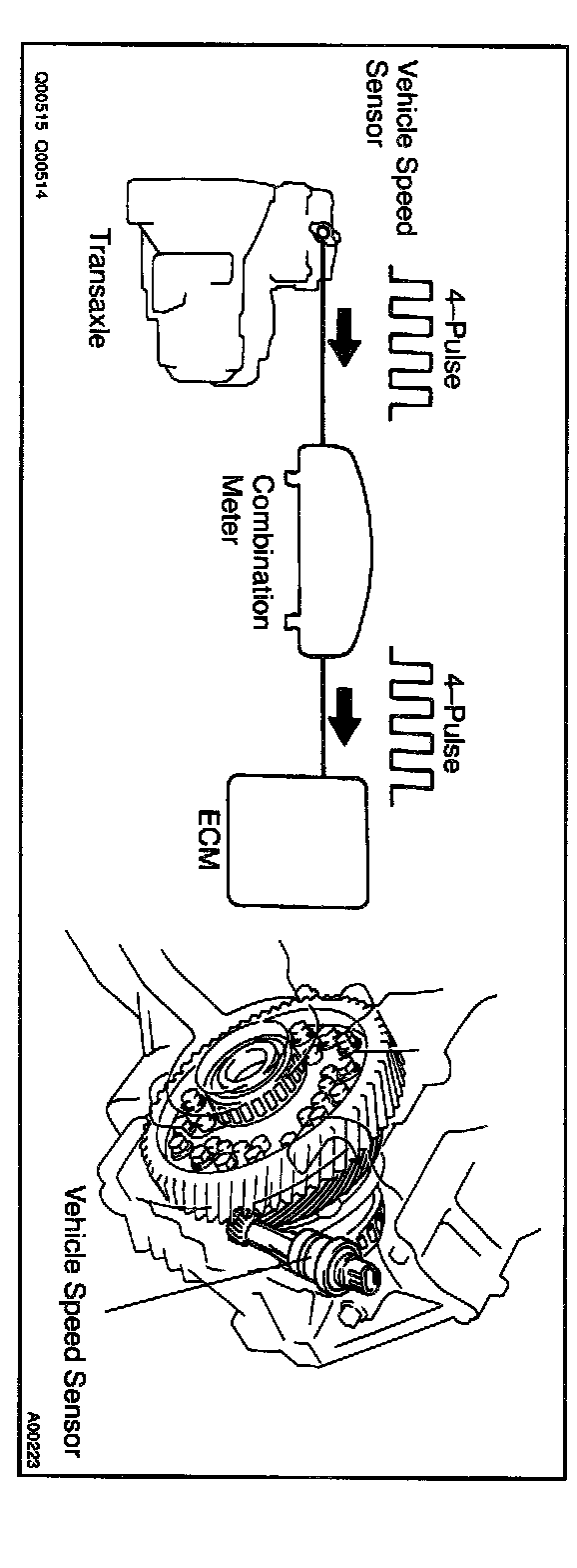 The vehicle speed sensor outputs a 4-pulse signal for every revolution of the rotor shaft, which is rotated by the transmission output shaft via the driven gear. After this signal is converted into a more precise rectangular waveform by the waveform shaping circuit inside the combination meter, it is then transmitted to the ECM. The ECM determines the vehicle speed based on the frequency of these pulse signals.