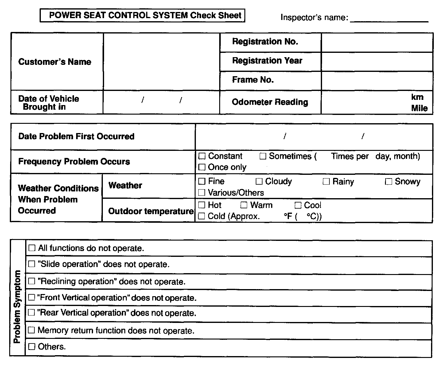 Power Seat Control System Check Sheet:
