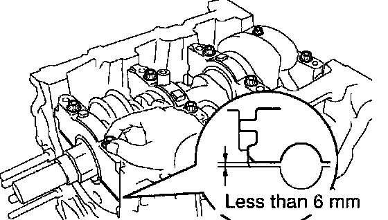 e) Insert the main bearing cap with your hand until the clearance between the main bearing cap and the cylinder block will become less than 6 mm (0.23 inch) by making the 2 internal main bearing cap bolts as a guide.