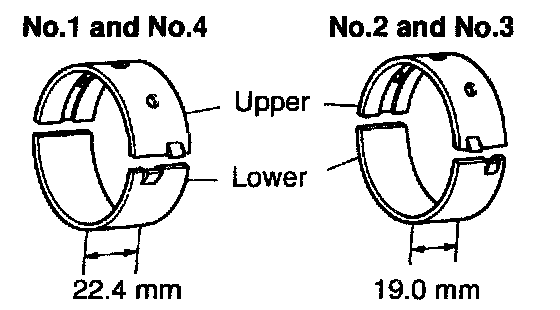 - Main bearings come in widths of 19.0 mm (0.748 inch) and 22.4 mm (0.882 inch). Install the 22.4 mm (0.882 inch) bearings in the No.1 and No.4 cylinder block journal positions with the main bearing cap. Install the 19.0 mm (0.748 inch) bearings in the No.2 and No.3 positions.