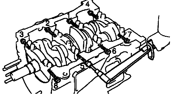 b) Install and uniformly tighten the 8 main bearing cap bolts in several passes, in the sequence shown.