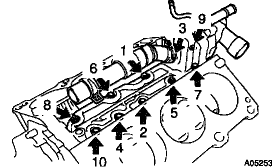 c) Install the water inlet housing with the 8 bolts and 2 nuts. Uniformly tighten the bolts and nuts in several passes, in the sequence shown.