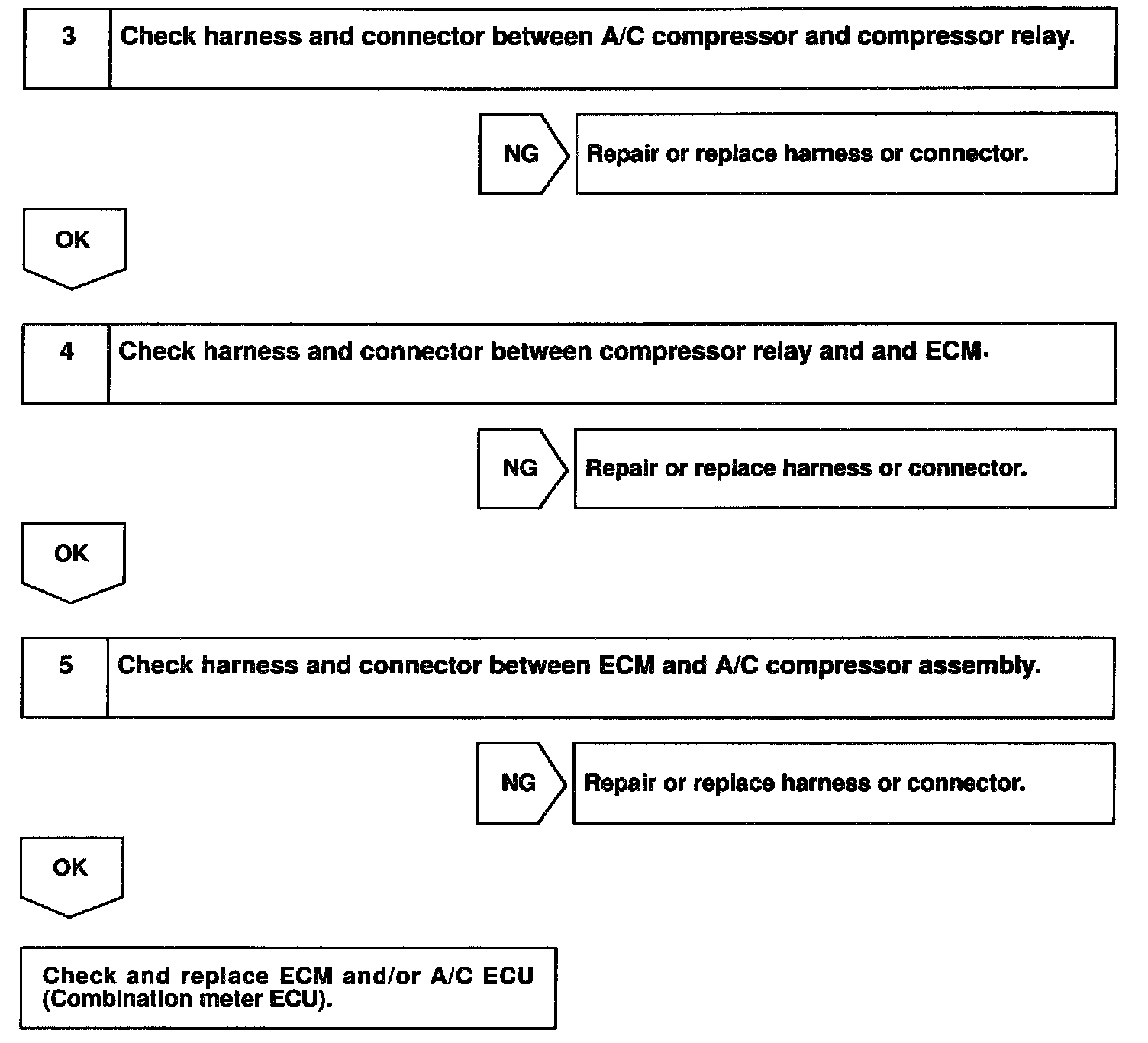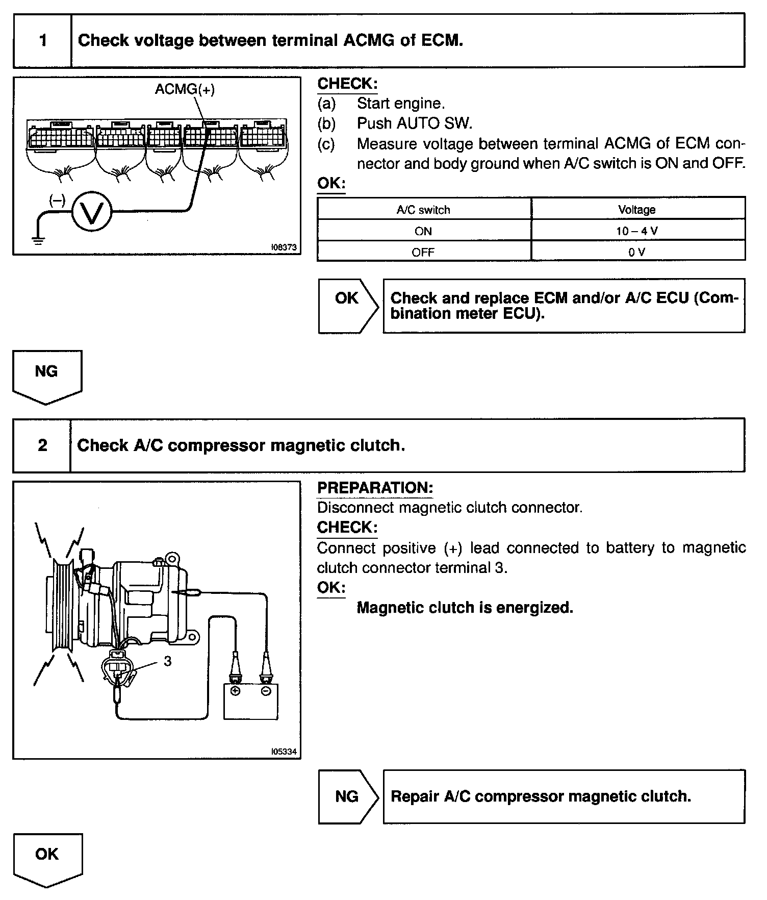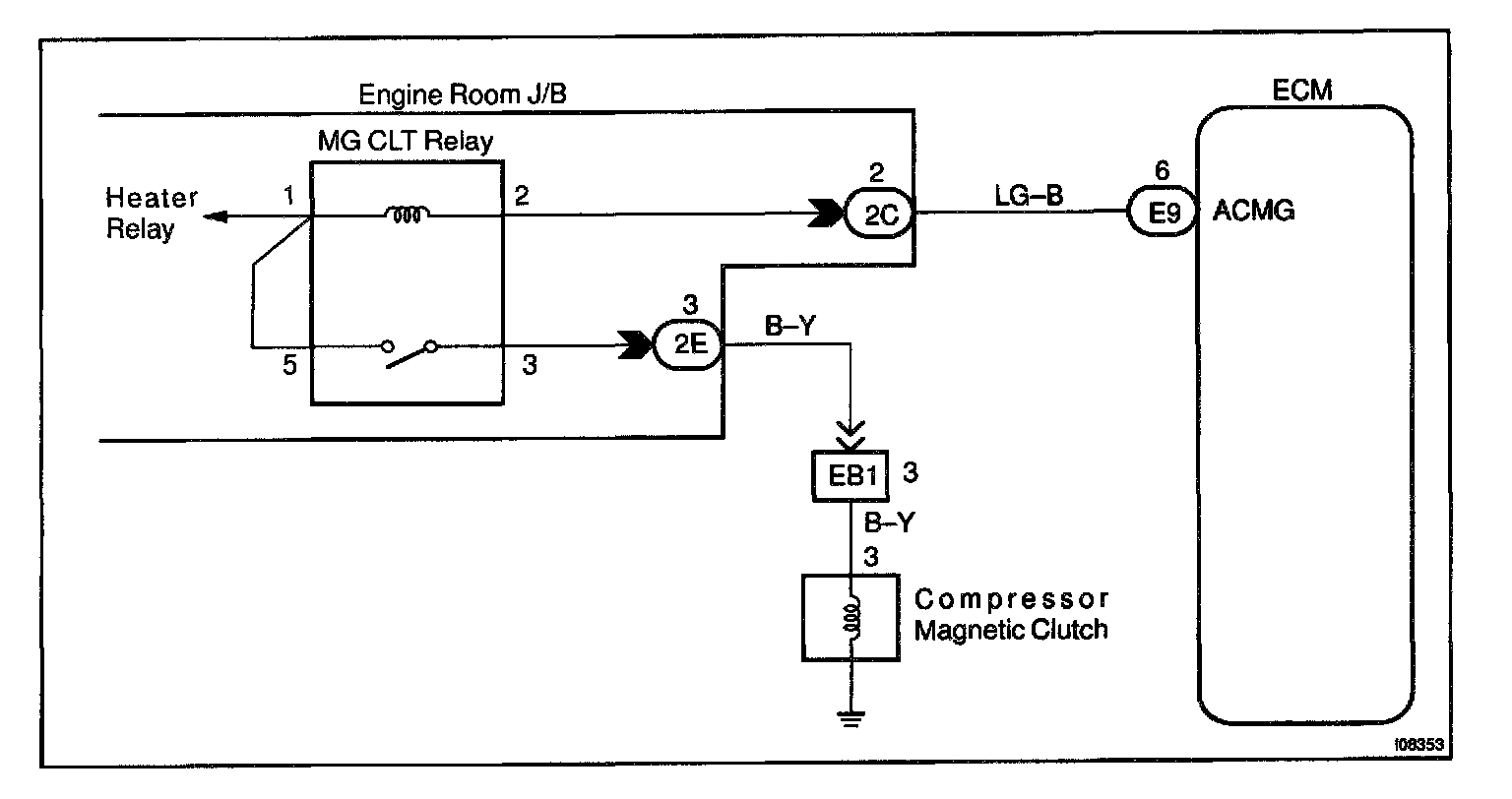 CIRCUIT DESCRIPTIONThe A/C ECU (Combination meter ECU) outputs the magnetic clutch ON signal from terminal MGC to the ECM. When the ECM receives this signal, it sends a signal from terminal ACMG and switches the A/C magnetic clutch relay ON, thus turning the A/C compressor magnetic clutch ON.