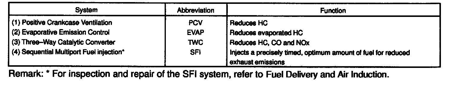 PURPOSEThe emission control Systems are installed to reduce the amount of CO, HC and NOx exhausted from the engine ((3) and (4)), to prevent the atmospheric release of blow-by-gas-containing HC (1) and evaporated fuel containing HC being released from the fuel tank (2).