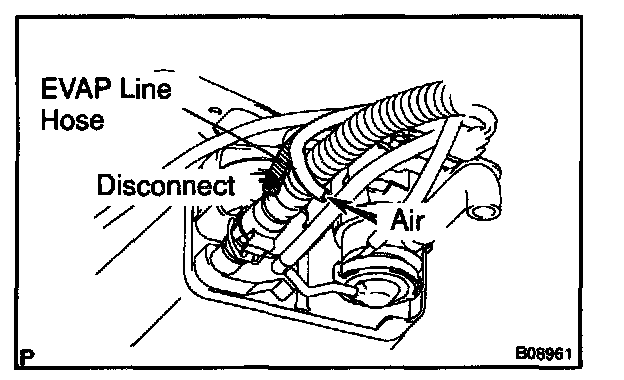a. Disconnect the EVAP line hose from the charcoal canister side and then pressurize and make the internal pressure in the fuel tank 4 kPa (41 gf/sq.cm, 0.58 psi).