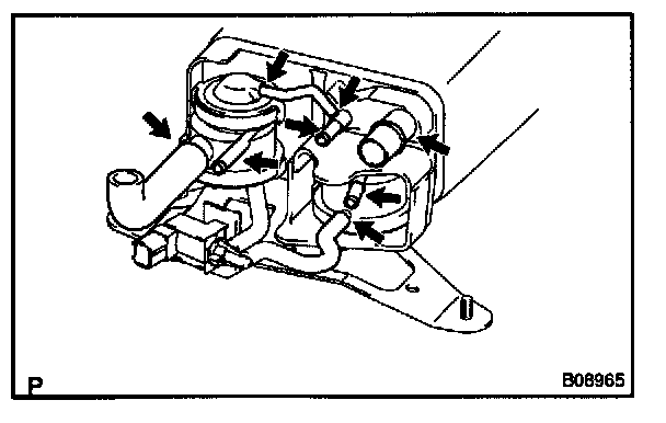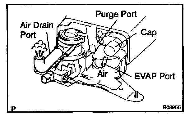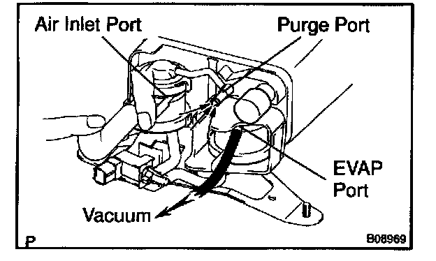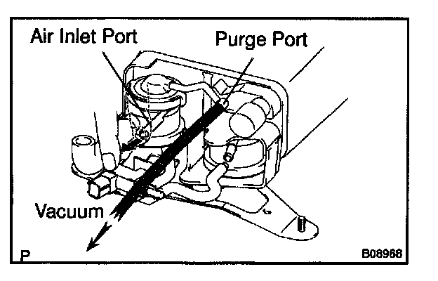 5. While holding the air inlet port closed, apply vacuum (3.43 kPa, 25.7 mmHg, 1.01 in.Hg) to the EVAP port and check that air flows into the purge port.