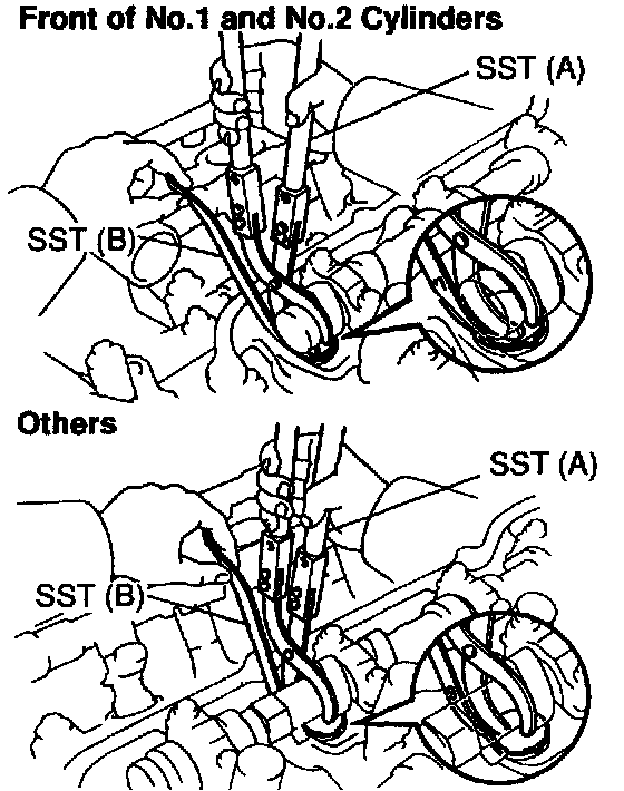 - Using SST (A), press down the valve lifter and place SST (B) between the camshaft and valve lifter. Remove SST (A).