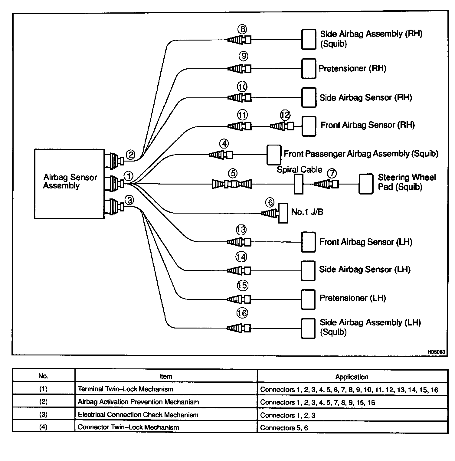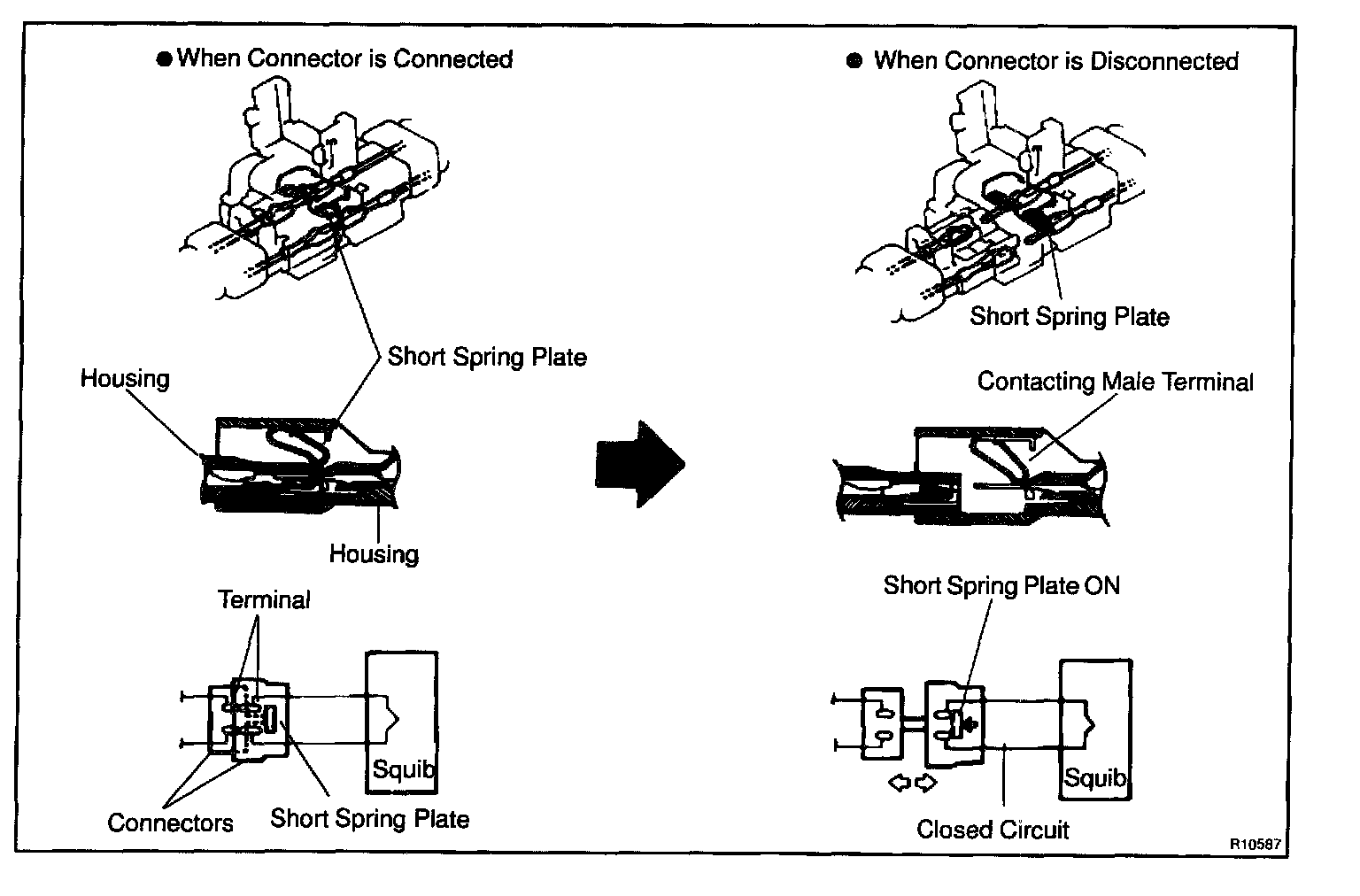 Each connector contains a short spring plate. When the connector is disconnected, the short spring plate automatically connects positive (+) terminal and negative (-) terminal of the squib.