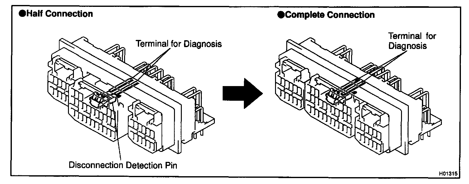 This mechanism electrically checks that connectors are connected correctly and completely. The electrical connection check mechanism is designed so that the disconnection detection pin connects with the diagnosis terminals when the connector housing lock is locked.