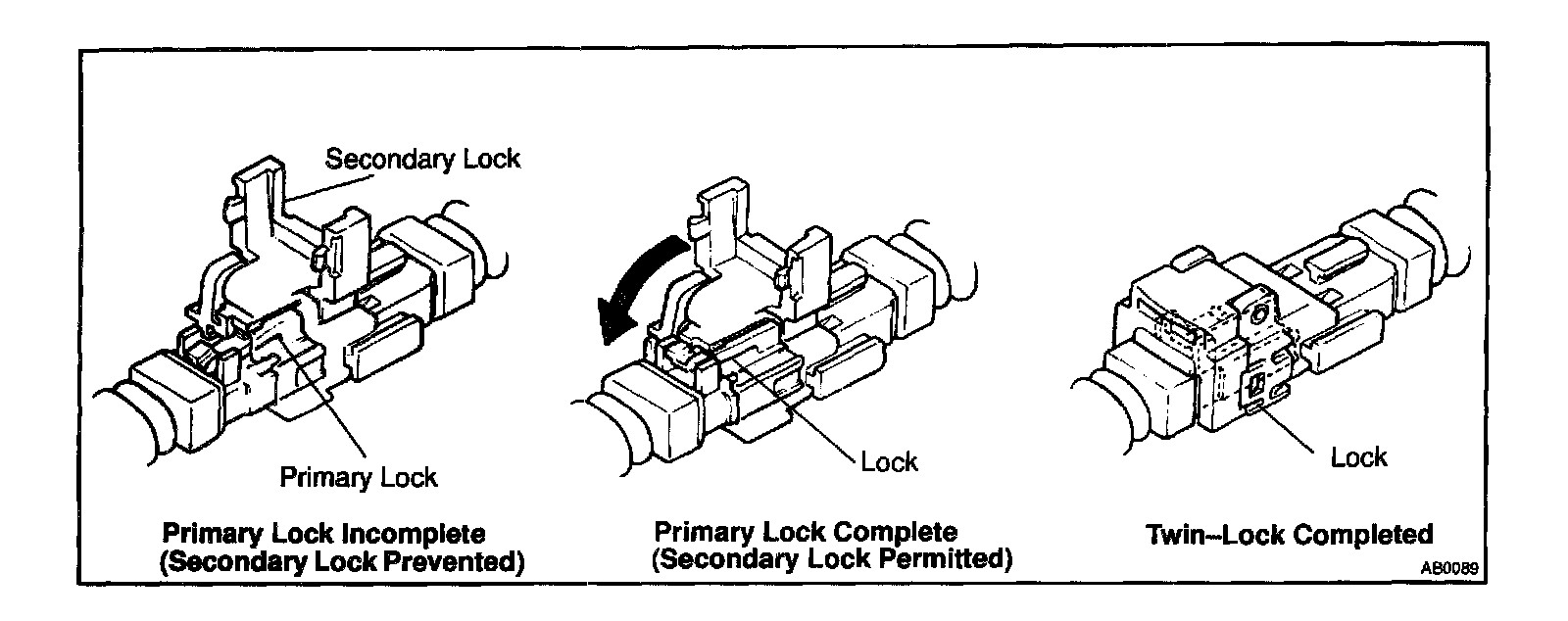 With this mechanism connectors (male and female connectors) are locked by 2 locking devices to increase the connection reliability. If the primary lock is incomplete, ribs interfere and prevent the secondary lock.