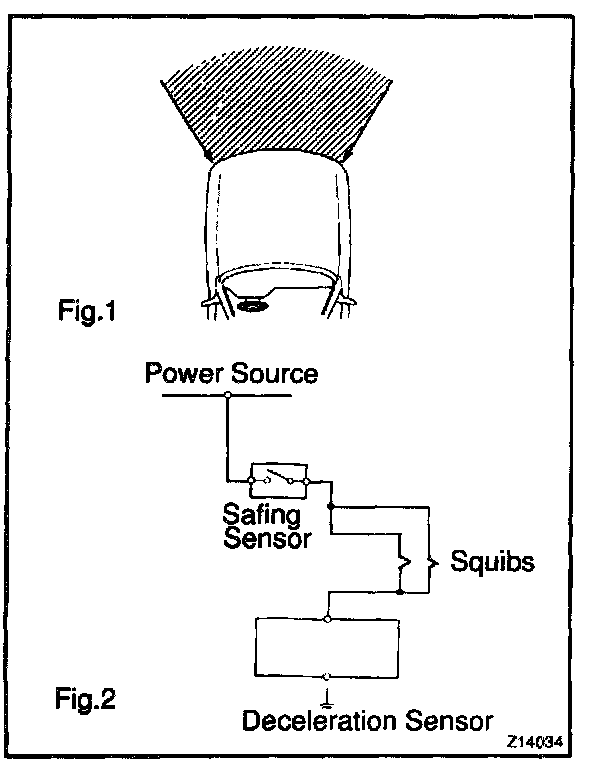 When the vehicle is involved in a frontal collision in the hatched area (Fig. 1) and the Shock is larger than the predetermined level, the SRS is activated automatically. A safing sensor is designed to go on at a smaller deceleration rate than the airbag sensor. As illustrated in Fig. 2, ignition is caused when current flows to the squib, which happens when a safing sensor and the deceleration sensor go on simultaneously. When a deceleration force acts on the sensors, 2 squibs in the driver airbag and front passenger airbag ignite and generate gas. The gas discharging into the driver airbag and front passenger airbag rapidly increases the pressure inside the bags, breaking open the steering wheel pad and instrument panel door.