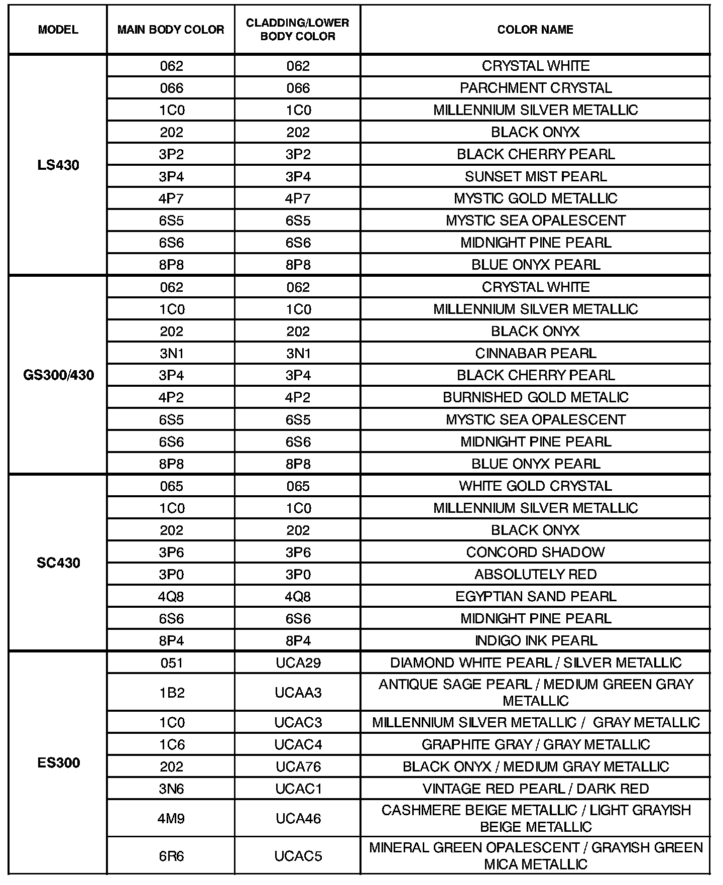 The following information outlines single and two-tone paint schemes used on 2001 model year Lexus vehicles.