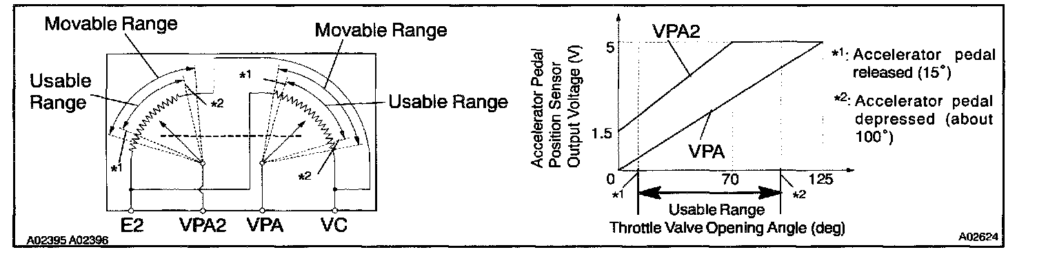 The ECM judges the current opening angle of the accelerator pedal from these signals input from terminals VPA and VPA2 and the ECM controls the throttle motor based on these signals.
