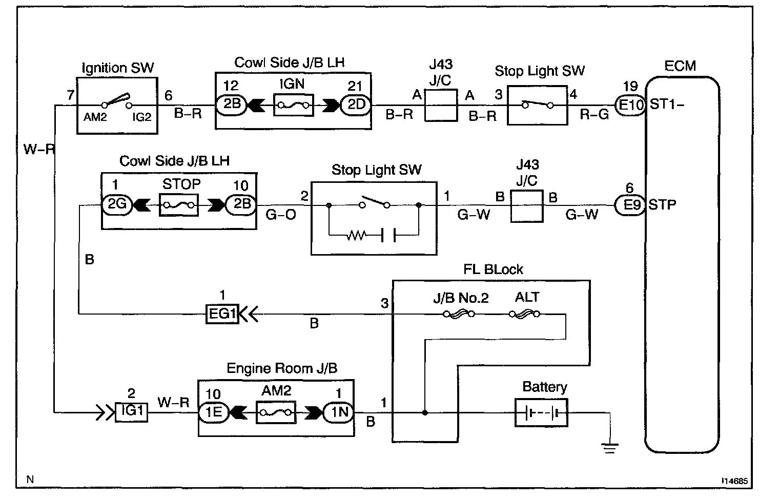 When the brake is on, battery positive voltage is normally applied through the STOP fuse and stop light switch to terminal STP of the ECM, and the ECM turns the cruise control OFF.