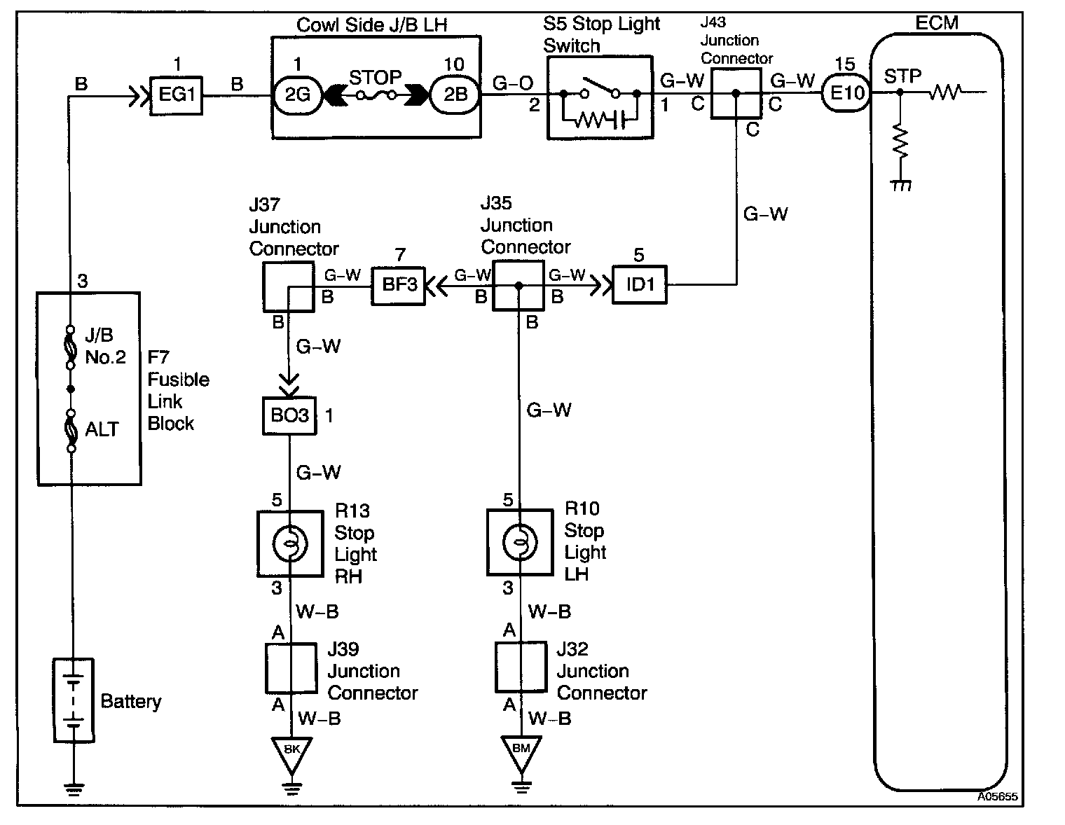 This signal is used to detect when the brakes have been applied. The STP signal voltage is the same as the voltage supplied to the stop lights.