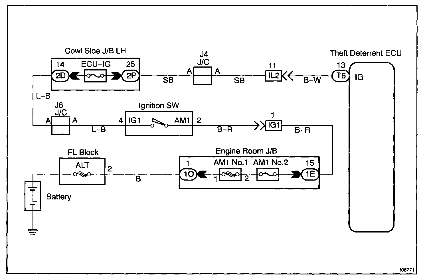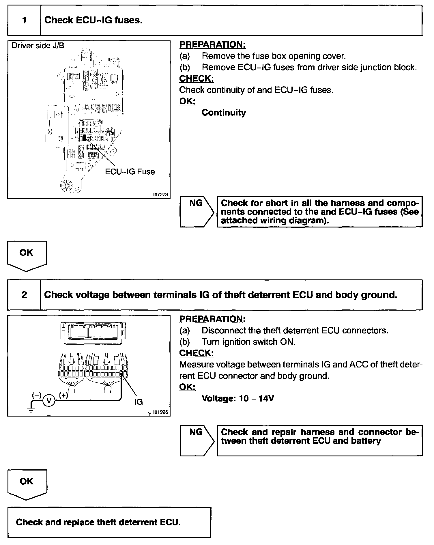 CIRCUIT DESCRIPTIONWhen the ignition switch is turned to the ACC position, battery positive voltage is applied to the terminal ACC of the ECU. Also, if the ignition switch is turned to the ON position, battery positive voltage is applied to the terminals ACC and IG of the ECU. When the battery positive voltage is applied to the terminal ACC of the ECU while the theft deterrent system is activated, the warning stops. Furthermore, power supplied from the terminals ACC and IG of the ECU is used as power for the door courtesy switch, and position switch, etc.