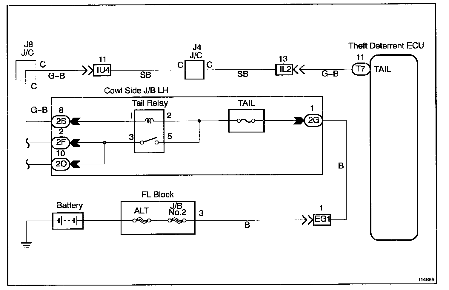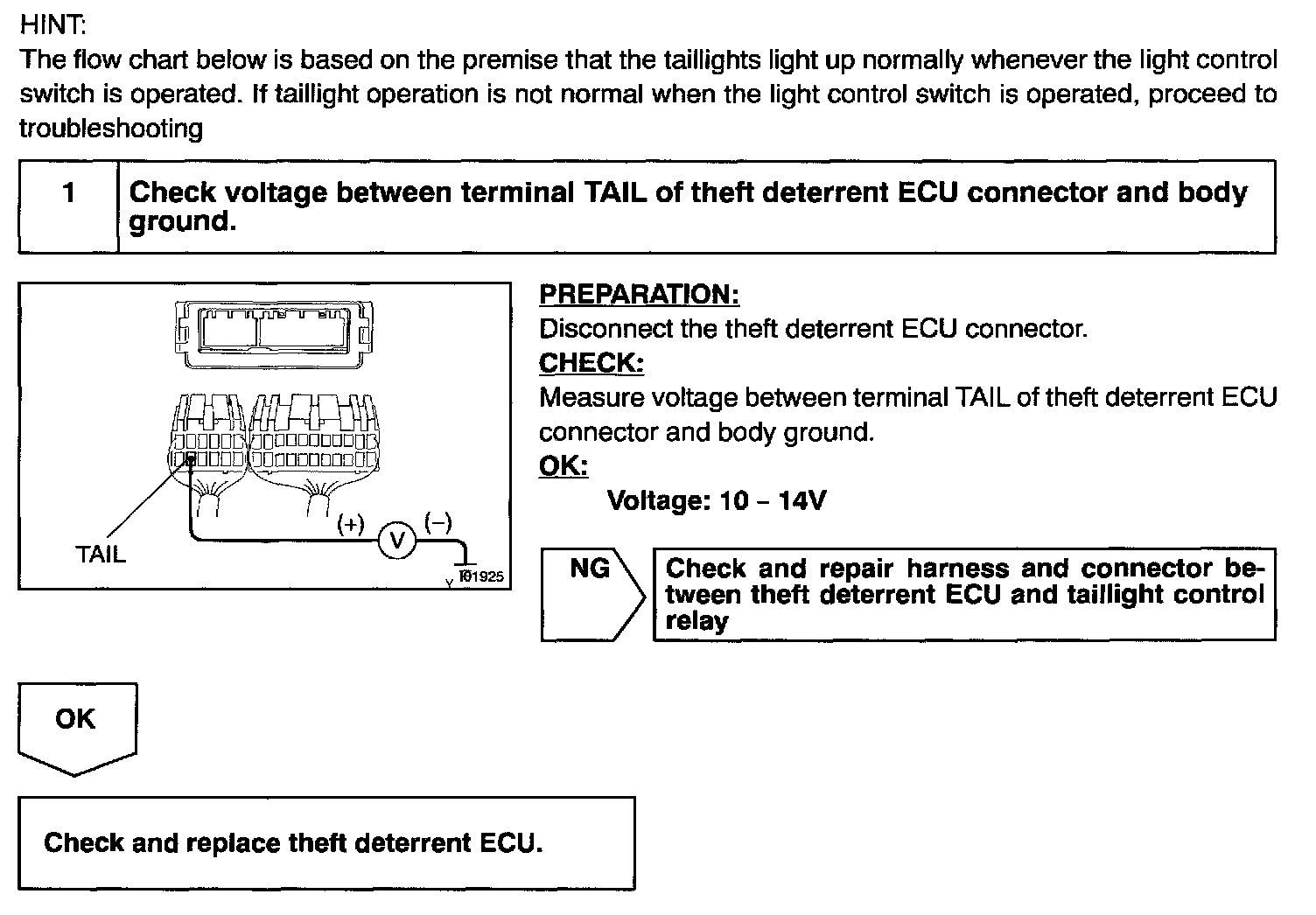 CIRCUIT DESCRIPTIONWhen the theft deterrent system is activated, it causes the Tr in the ECU to switch ON and OFF at approximately 0.4 sec. intervals. This switches the taillight control relay ON and OFF, thus flashing the taillights (See the wiring diagram).