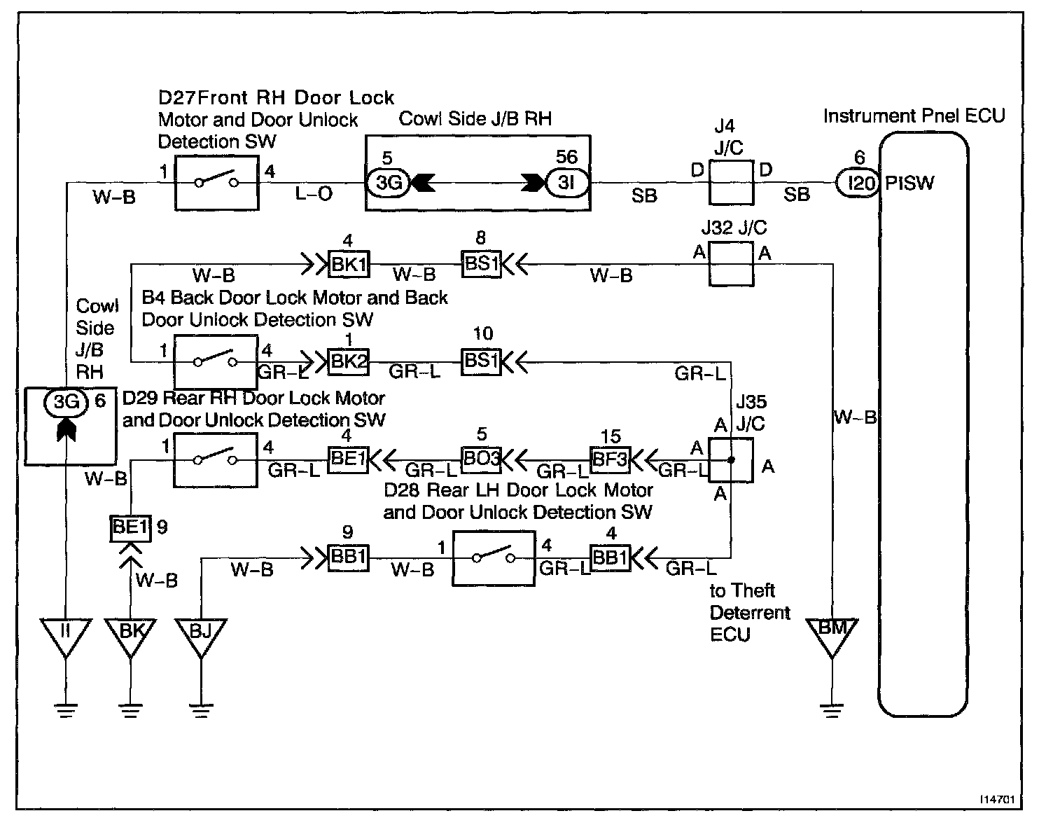 CIRCUIT DESCRIPTIONThe door unlock detection switch is built in the door lock motor assembly. This switch is ON when the door lock knob is in the unlock position and OFF when the lock knob is in the lock position. The ECU detects the door lock knob conditions is this circuit. It is used as one of the operating conditions for the key confinement prevention function.