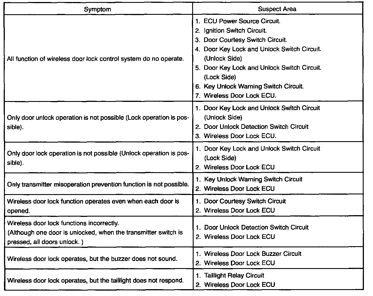 - Troubleshooting of the wireless door lock control system is based on the premise that the door lock control system and theft deterrent system are operating normally. Accordingly, before troubleshooting the wireless door lock control system, first make certain that the door lock control system and theft deterrent system are operating normally.