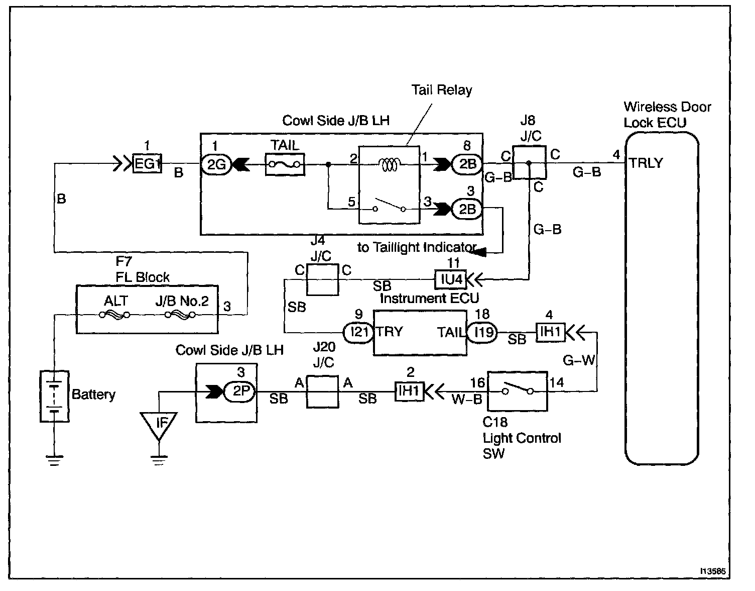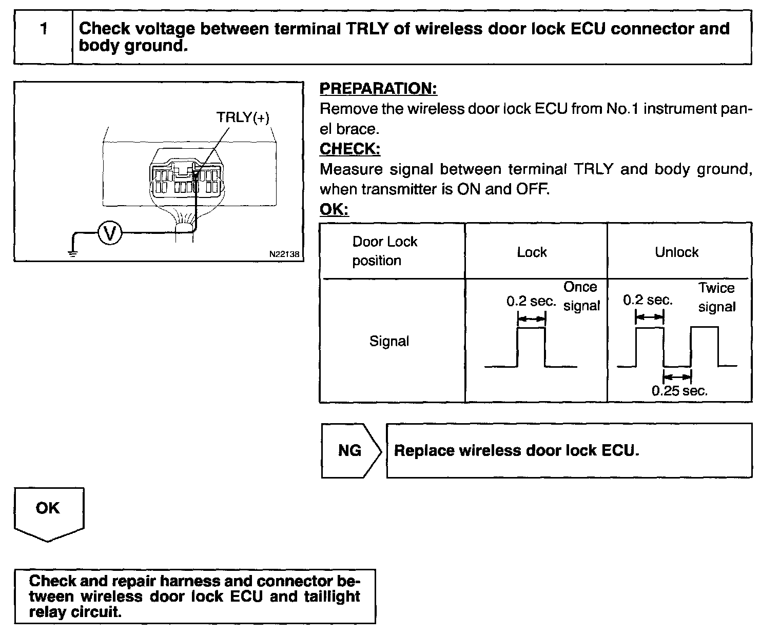 CIRCUIT DESCRIPTIONTRLY terminal outputs the signal once when pressing the LOCK switch of the transmitter and twice when pressing the UNLOCK switch and then makes the taillight come to light.
