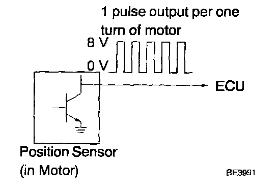 CIRCUIT DESCRIPTIONThe position sensor senses movement of the seat and send pulse signals to the ECU. The position sensor sends pulse to the ECU in proportion to the amount of seat movement, as shown in the diagram on the left.