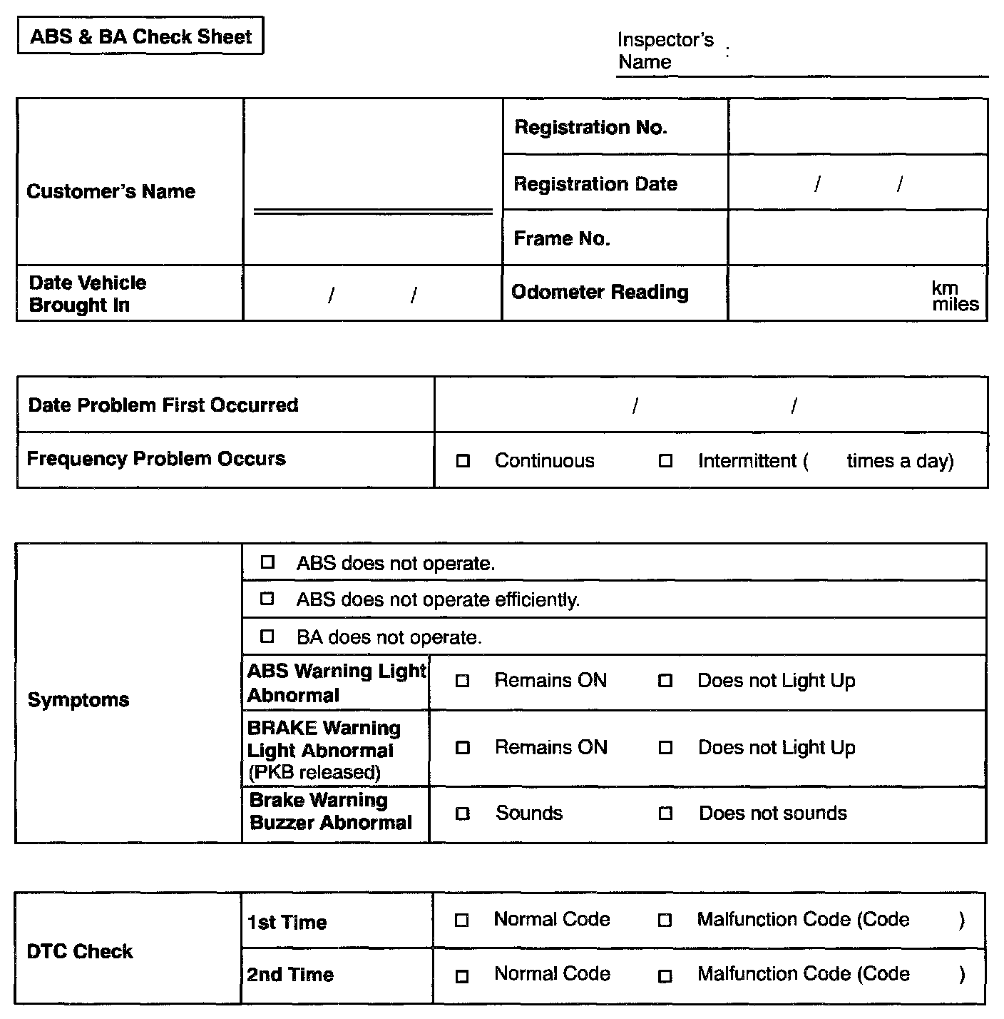 ABS & BA Check Sheet: