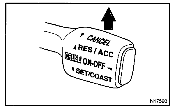 3. Check that the vehicle speed increases while the control switch is turned to RES/ACC, and that the vehicle cruises at the set speed when the switch is released.