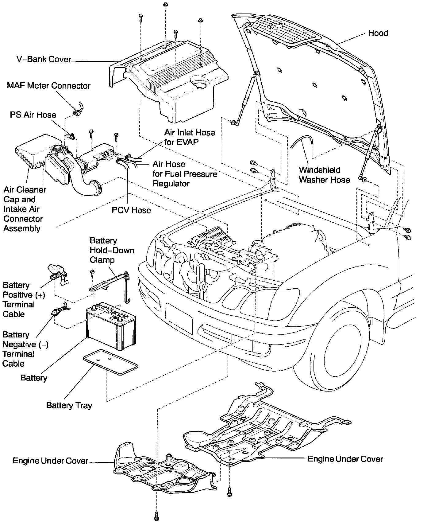 - Battery negative (-) cable from right fender apron