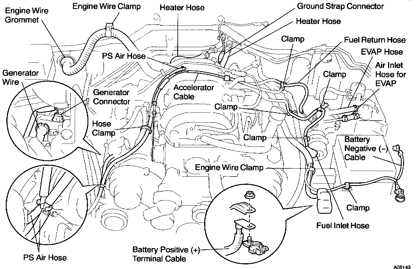 - 2 PS air hoses to hose clamp on No.3 RH timing belt cover