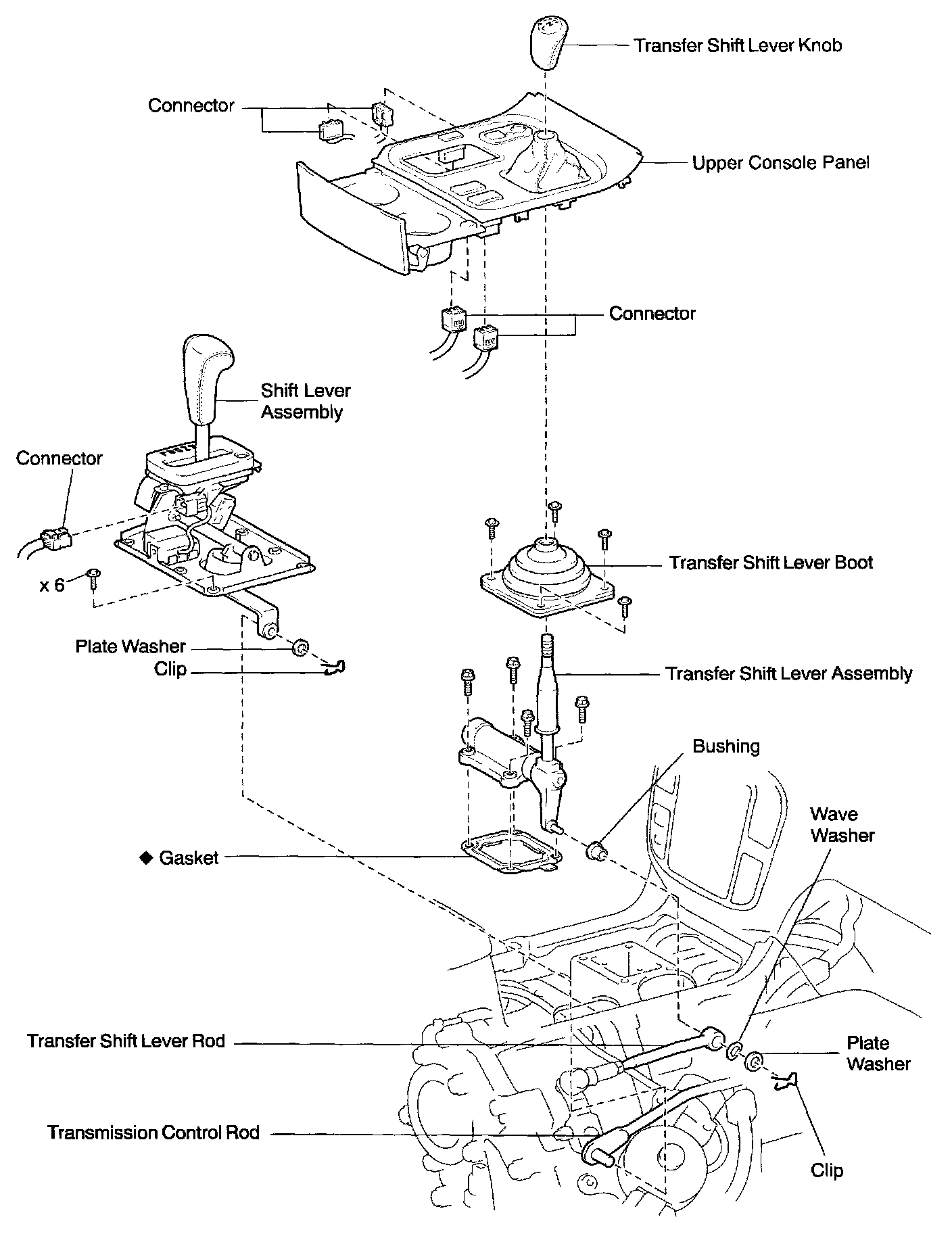 1. Remove the clip, plate washer and wave washer, and disconnect the transfer rod from the shift lever.