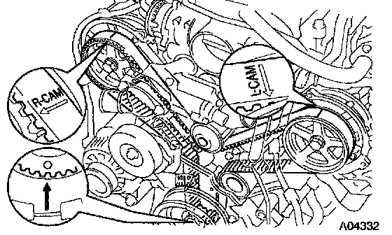 If the installation marks have disappeared, before remove the timing belt, place 2 new installation marks on the timing belt to match the timing marks of the camshaft timing pulleys.
