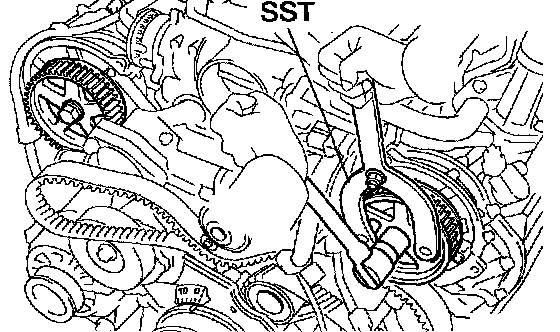 a. Using SST, loosen the tension spring between the LH and RH camshaft timing pulleys by slightly turning the LH camshaft timing pulley clockwise.