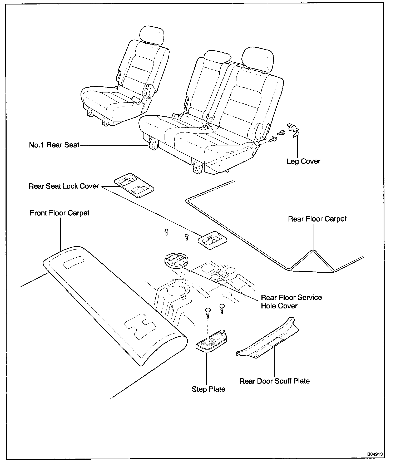 2. REMOVE REAR DOOR SCUFF PLATES, STEP PLATES AND REAR SEAT LOCK COVERS