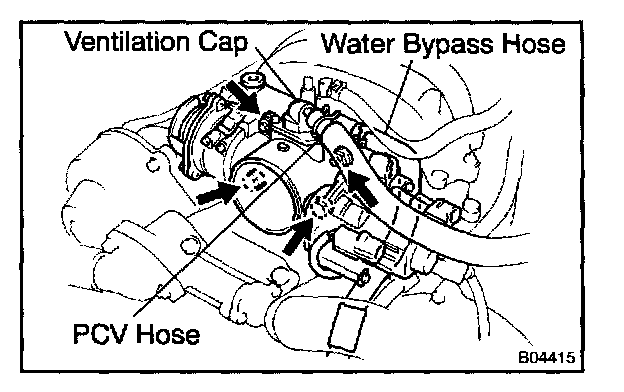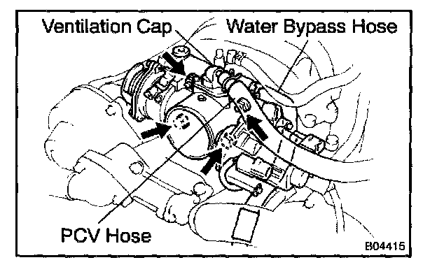 b. Disconnect the PCV hose and water bypass hose from the throttle body.