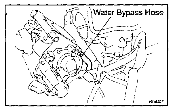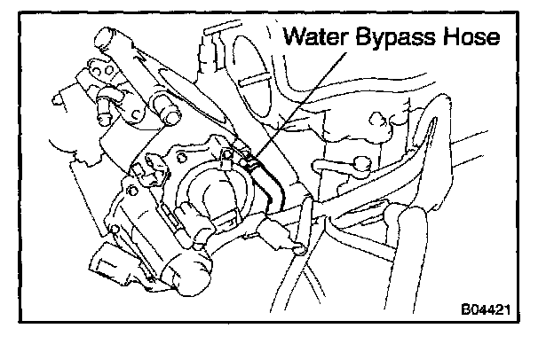 e. Disconnect the water bypass hose from the manifold thermostat on the throttle body, and remove the throttle body.