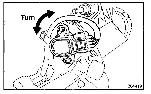 4. While reading the valve of the throttle valve opening percentage THROTTLE POS) of the CURRENT DATA, turn the throttle position sensor slowly to left and right and set the sensor at the center value of the standard value, and then tighten the screws.