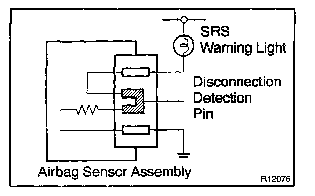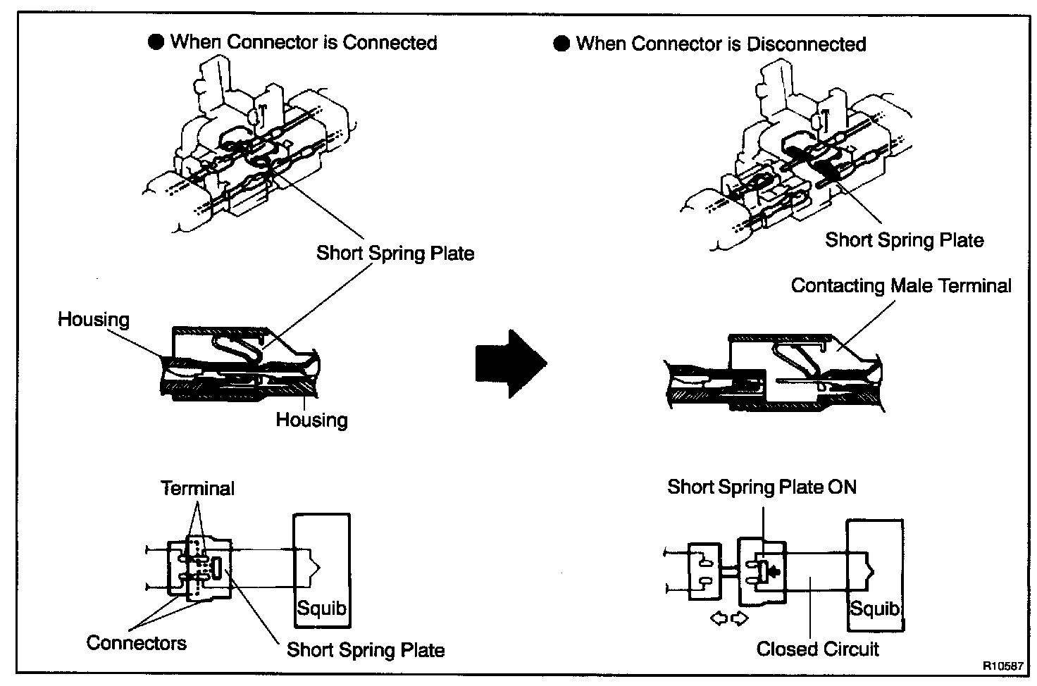 Each connector contains a short spring plate. When the connector is disconnected, positive (+) terminal and negative (-) terminal of the squib are attached.