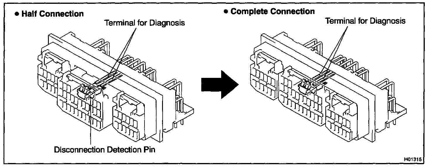 This mechanism is designed to electrically check if connectors are connected correctly and completely. The electrical connection check mechanism is designed so that the connection detection pin connects with the diagnosis terminals when the connector housing lock is in the locked condition.
