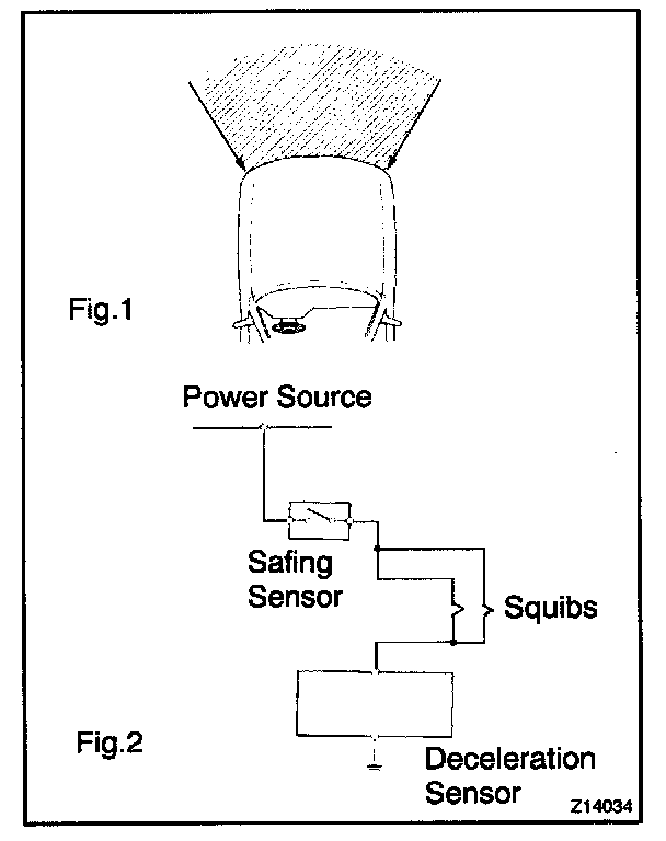 b. When the vehicle is involved in a frontal collision in the hatched area (Fig. 1) and the shock is larger than a predetermined level, the SRS is activated automatically. A safing sensor is designed to go on at a smaller deceleration rate than the airbag sensors. As illustrated in Fig. 2, ignition is caused when a safing sensor and the deceleration sensor go on simultaneously. When a deceleration force acts on the sensors, two squibs in the driver airbag and front passenger airbag ignite and generate gas. The gas discharging into the driver and front passenger airbags rapidly increases the pressure inside the bags breaking open the steering wheel pad and instrument panel door.