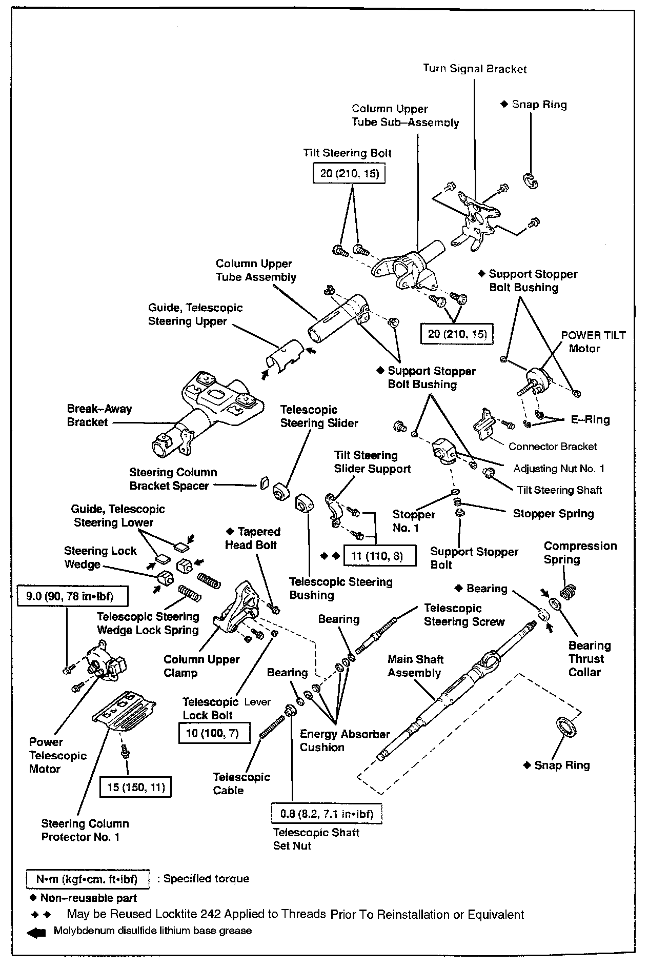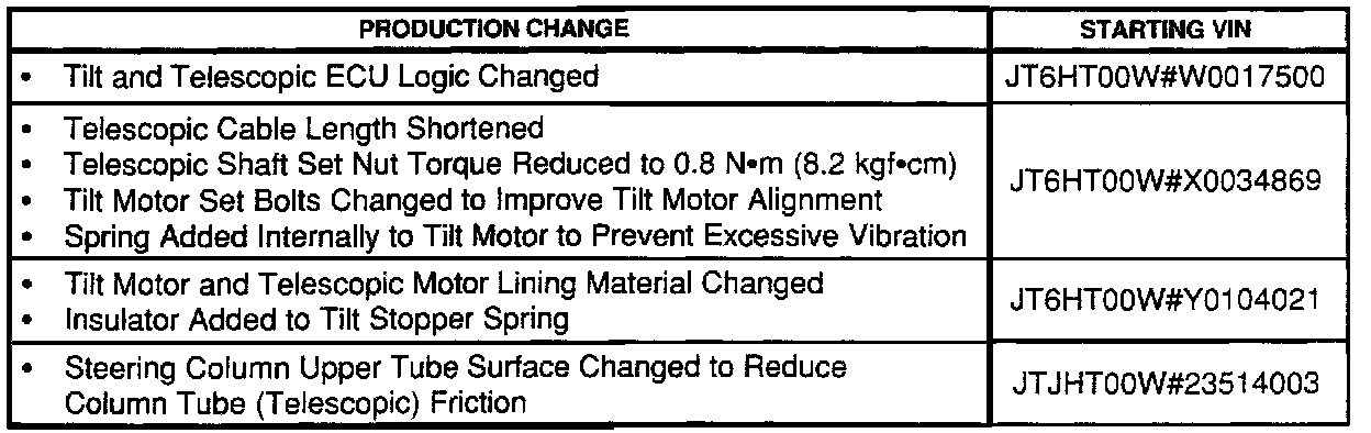 Production countermeasures have been implemented to reduce noise and improve smoothness of adjustment operations of the Tilt/Telescopic Steering Column Assembly.