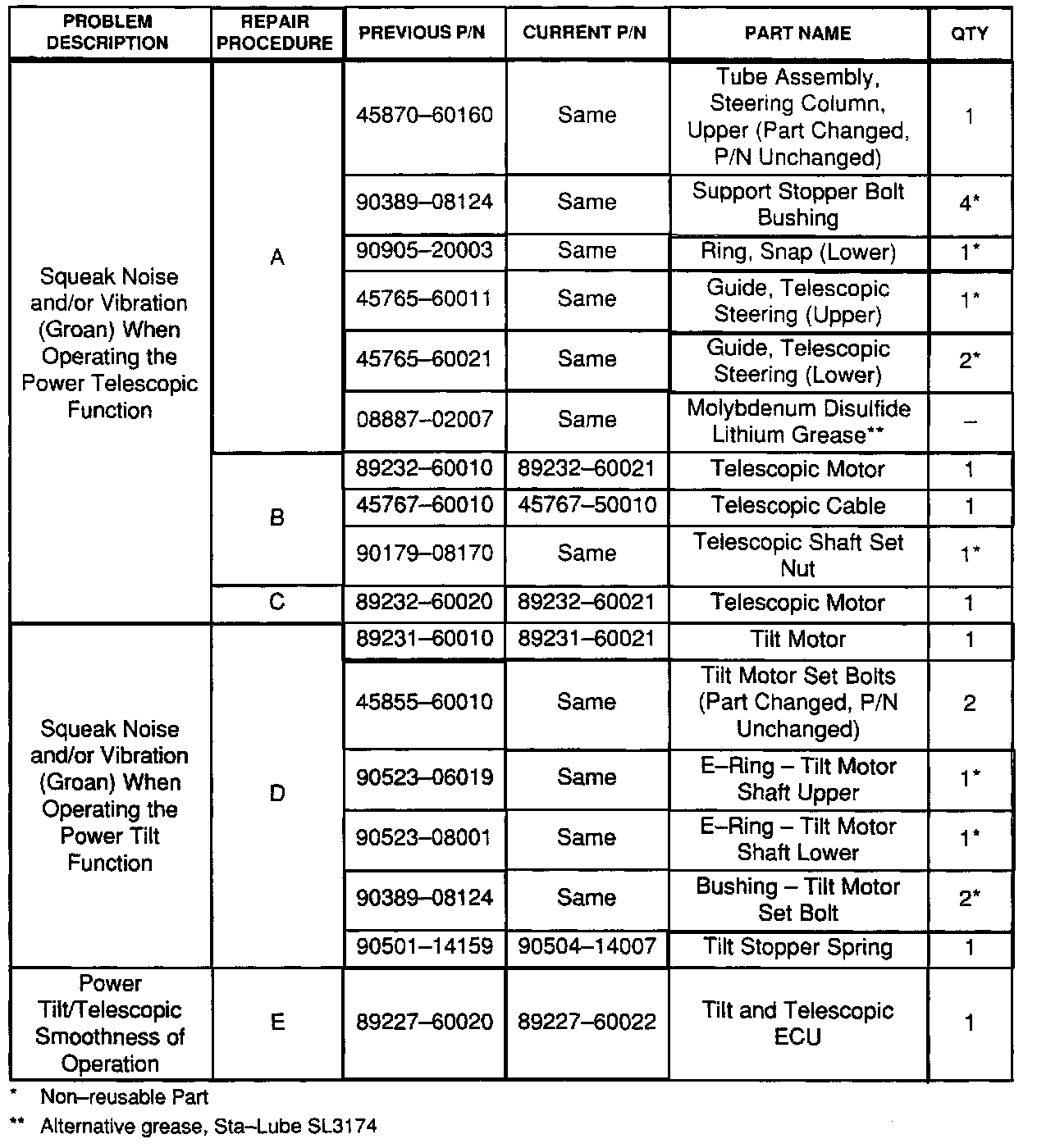 2. Squeak Noise and/or Vibration (Groan) When Operating the Power Telescopic Function.