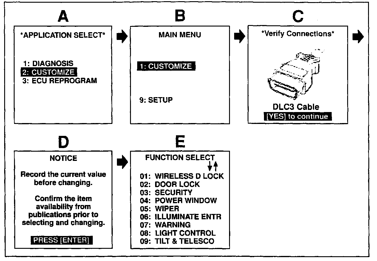 3. Using the Diagnostic Tester, follow the screen flow shown to access the customize function select menu.