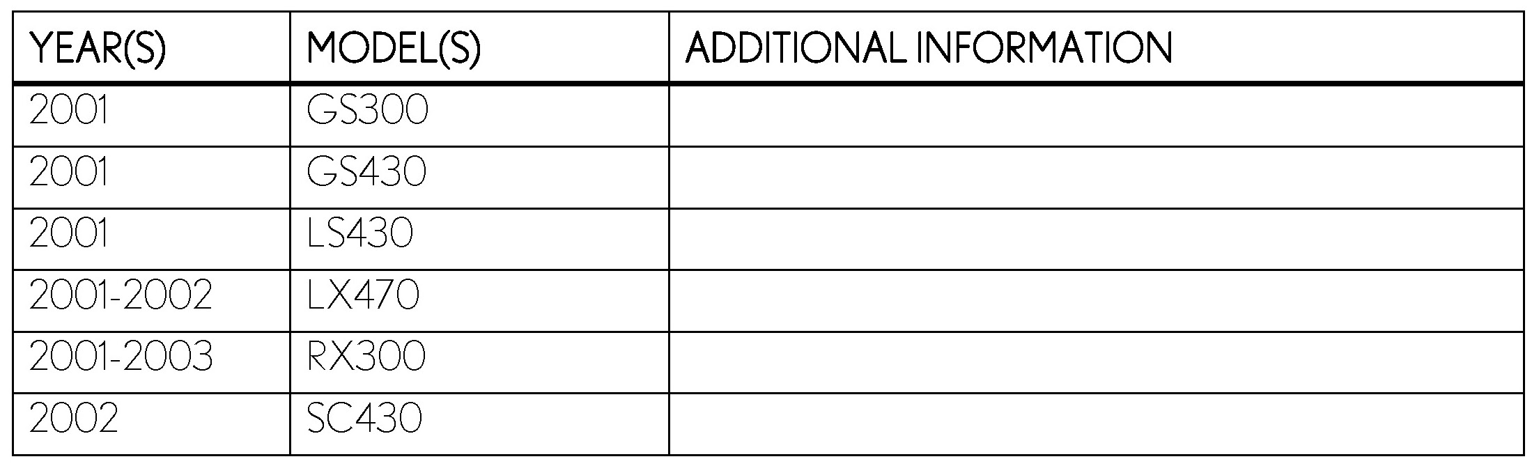 '01-'03 Applicable Lexus vehicles