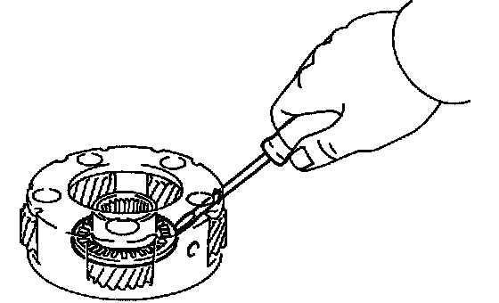 h. Using a screwdriver, remove the bearing and race from the front planetary gear.