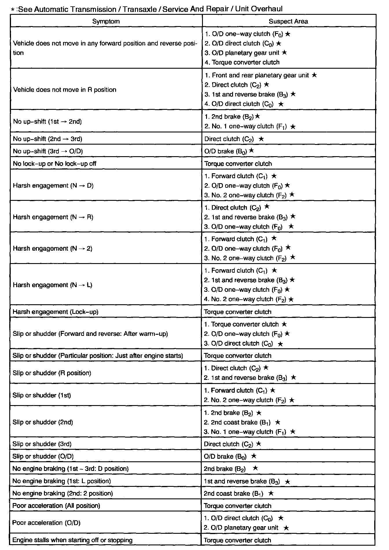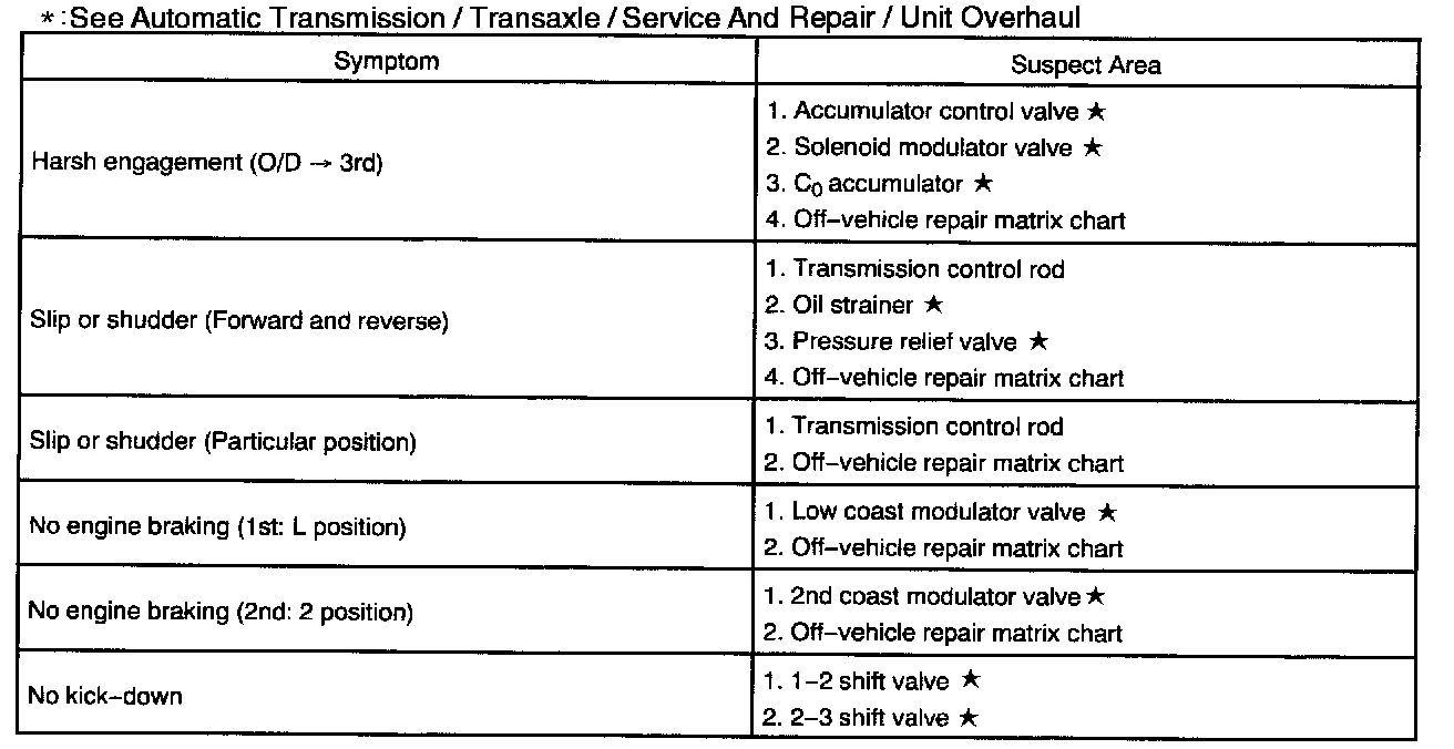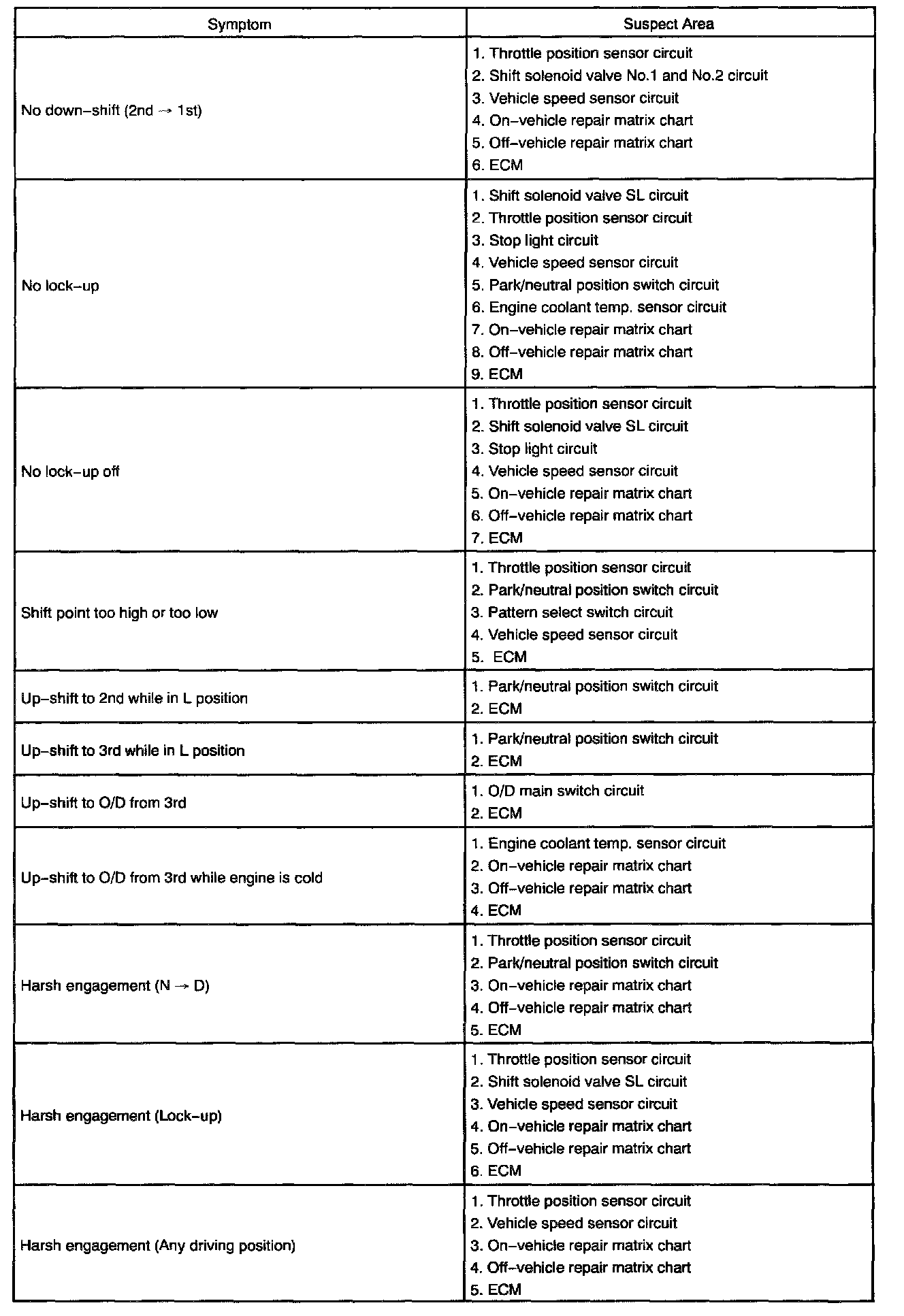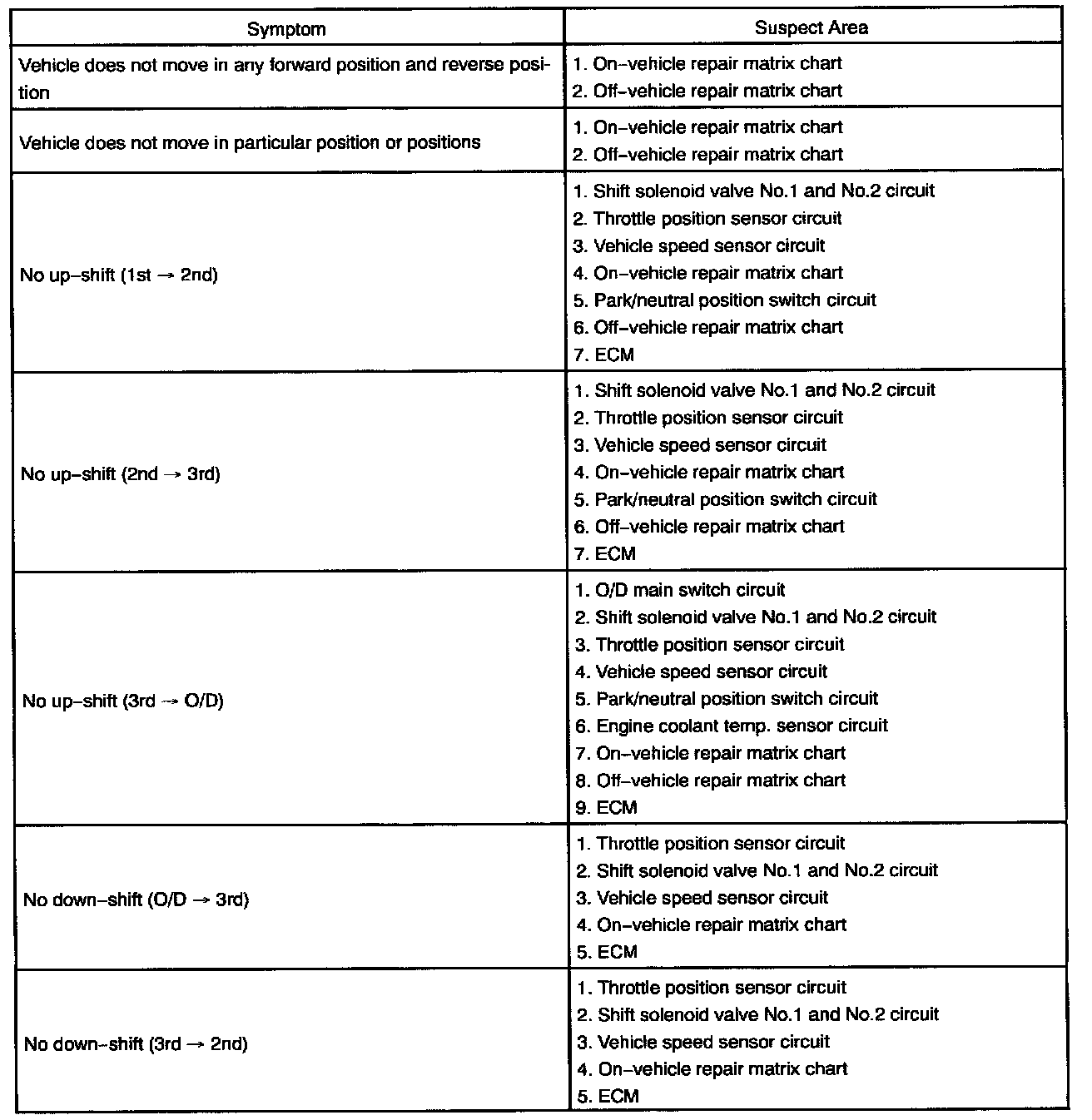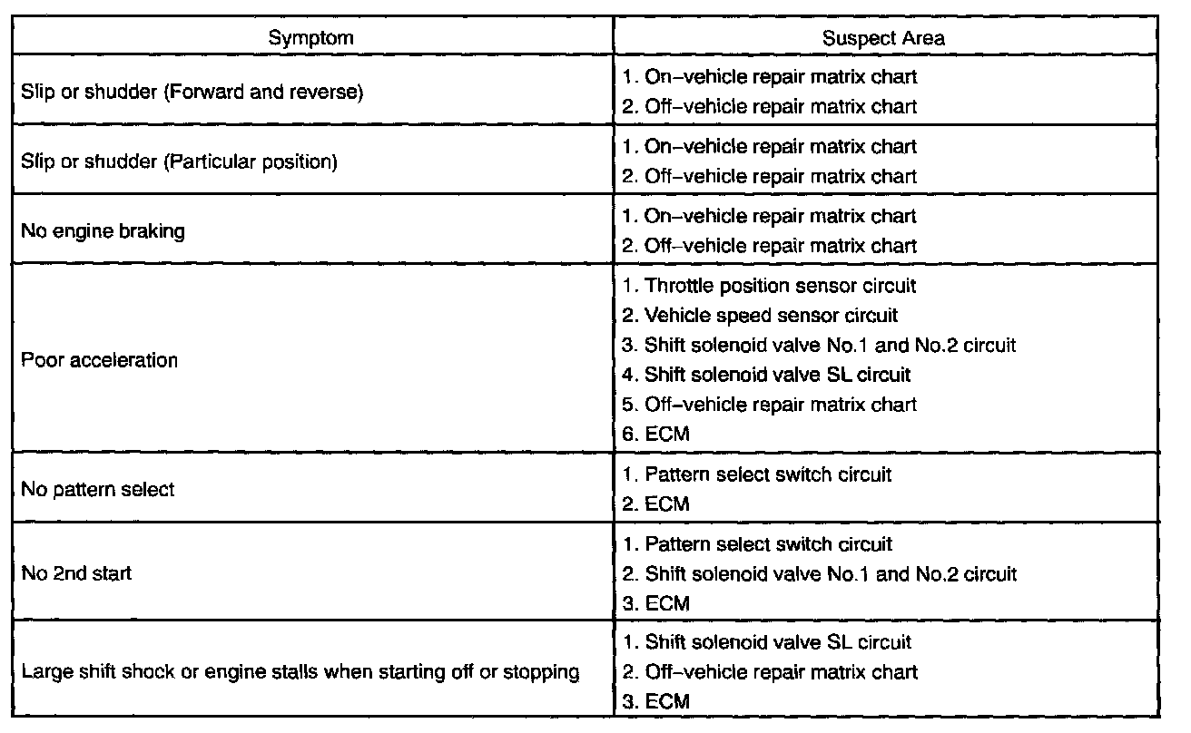 PROBLEM SYMPTOMS TABLEIf a normal code is displayed during the diagnostic trouble code check but the trouble still occurs, check the circuits for each symptom in the order given in the charts and proceed to troubleshooting.