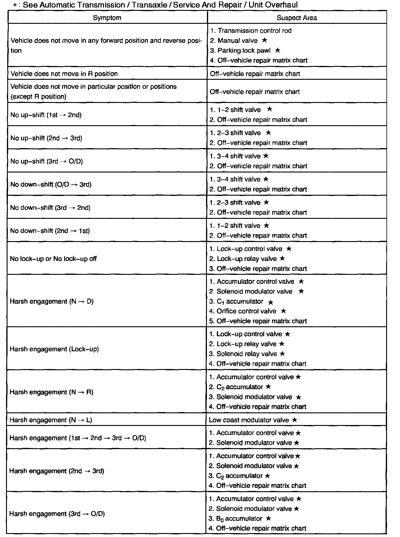 Chart 2: On-vehicle Repair Matrix Chart