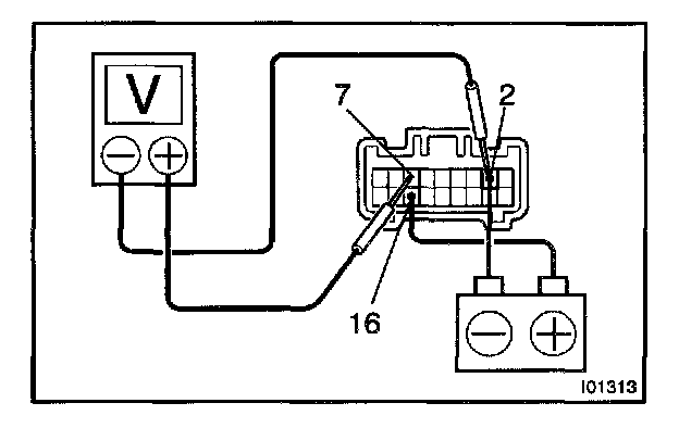 d. Connect the positive (+) lead from the voltmeter to terminal 7 and the negative (-) lead to terminal 2, check that the meter needle indicates battery voltage.