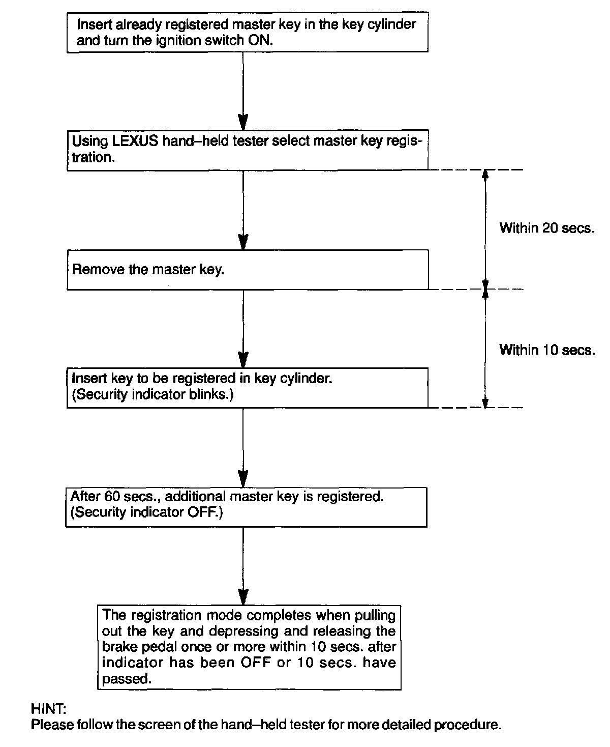 d. There are 2 ways for registration of additional master key, one way is depressing brake pedal and acceleration pedal and the other way is using LEXUS hand-held tester.