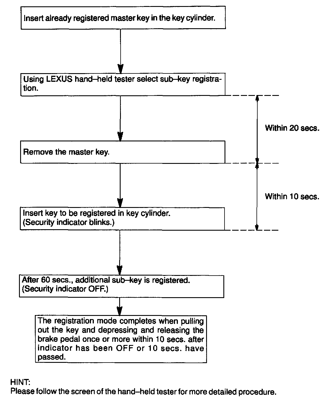 There are 2 ways for registration of additional sub-key, one way is depressing brake pedal and acceleration pedal and the other way is using LEXUS hand-held tester.