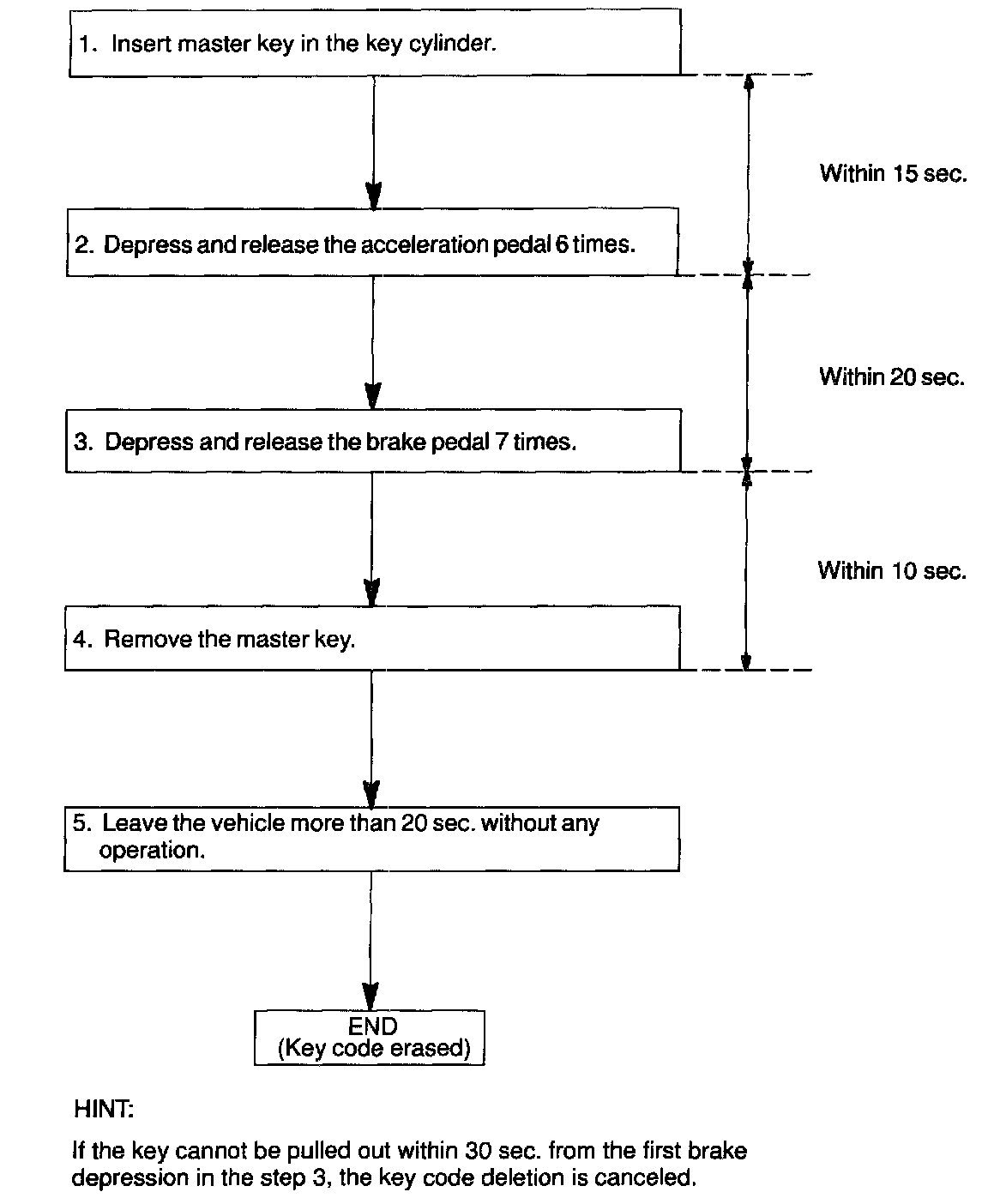 There are 2 ways for erasure of transponder key code, one way is depressing brake pedal and acceleration pedal and the other way is using LEXUS hand-held tester.